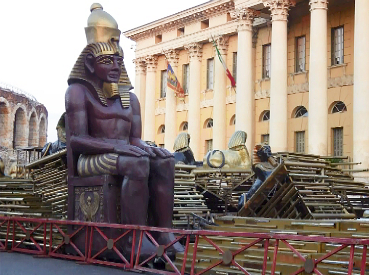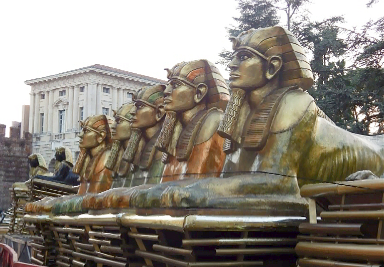 Part of the inconvenience for tonight’s opera was that being an ancient Roman arena, there was no built-in storage area for the props and scenery of an Opera the size of ‘Aida’. Therefore, all the props and staging materials had to be stored in the piazza outside the arena so we were able to make a close inspection of the structures that made up the amazing background spectacle of the opera. It only made us look forward to the show even more. Unfortunately, disappointment awaited us that night due to the other inconvenience of Roman arenas, no roof had survived the 17 centuries since the last roof had been in place. A big storm came in half-way through the show and so watching an opera in the rain slowly became less attractive by the minute…we only survived the first two acts.