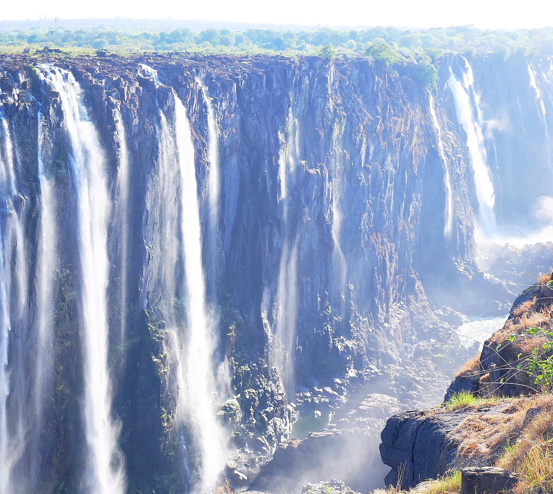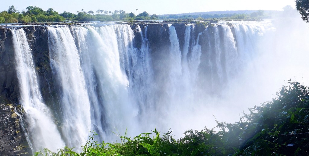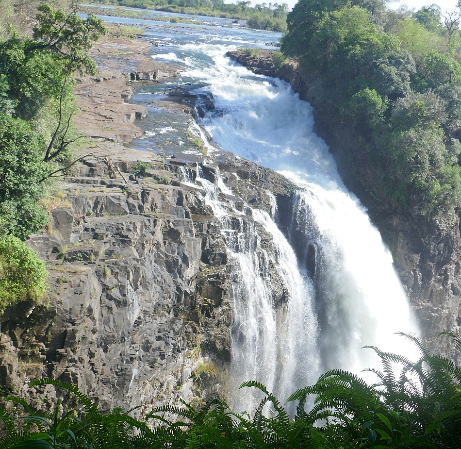 The Victoria Falls is a world famous series of waterfalls where the Zambezi River flows over a large, level sheet of Basalt in a shallow valley and falls into a large chasm (the First Gorge) that is between 80 and 108 metres deep. It is located on the border between Zimbabwe and Zambia. It is not the world’s highest or widest waterfalls but it is classified as the largest waterfall in the world due to its combined width. The diagram below shows the series of waterfalls that flow over into the chasm which then flows into a series of gorges and the Zambezi’s water eventually enters the Indian Ocean on the coast of Mozambique.