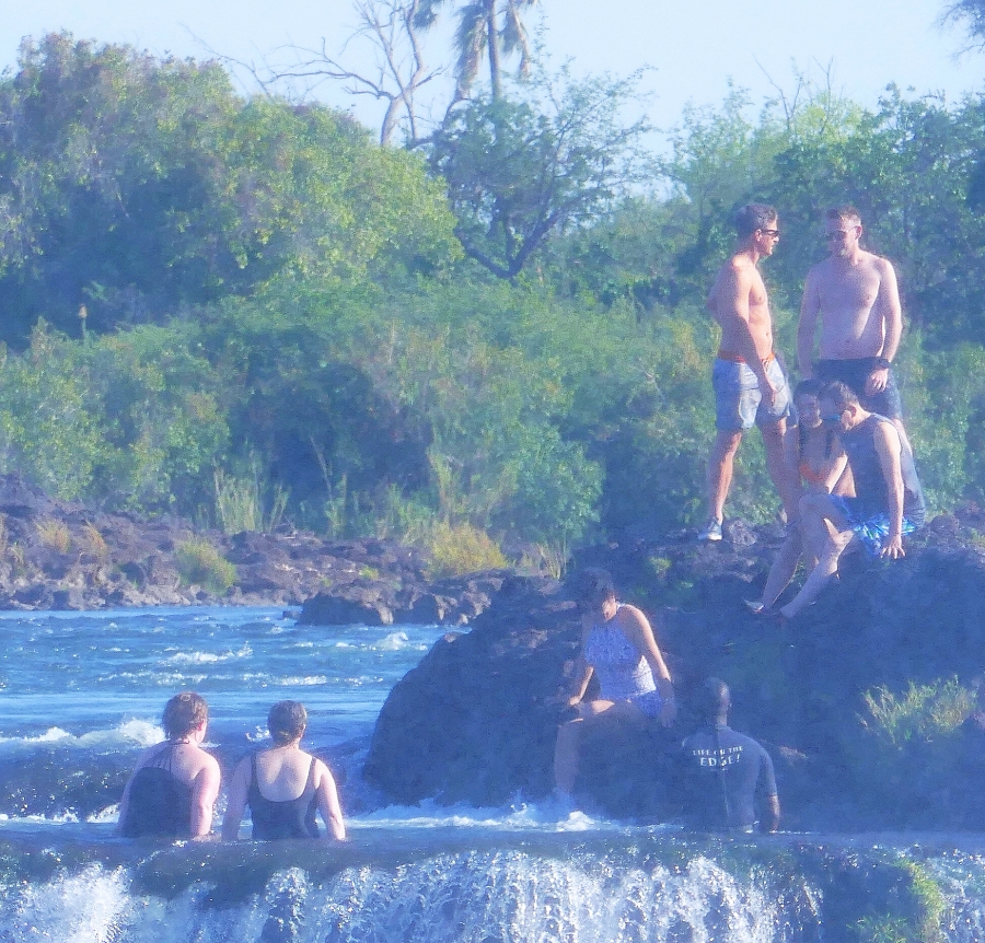 In the two images below, people can be seen (presumably ‘adrenalin junkies’) who have made their way to the Devil’s Pool that sits on top of one of the waterfalls on the Zambian side of Victoria Falls. It was described on one web site as “Arguably the most extreme infinity pool in the world.” Call me conservative but if I wanted to swim in an ‘Infinity’ pool, I wouldn’t choose one that sits next to the edge of Victoria Falls.