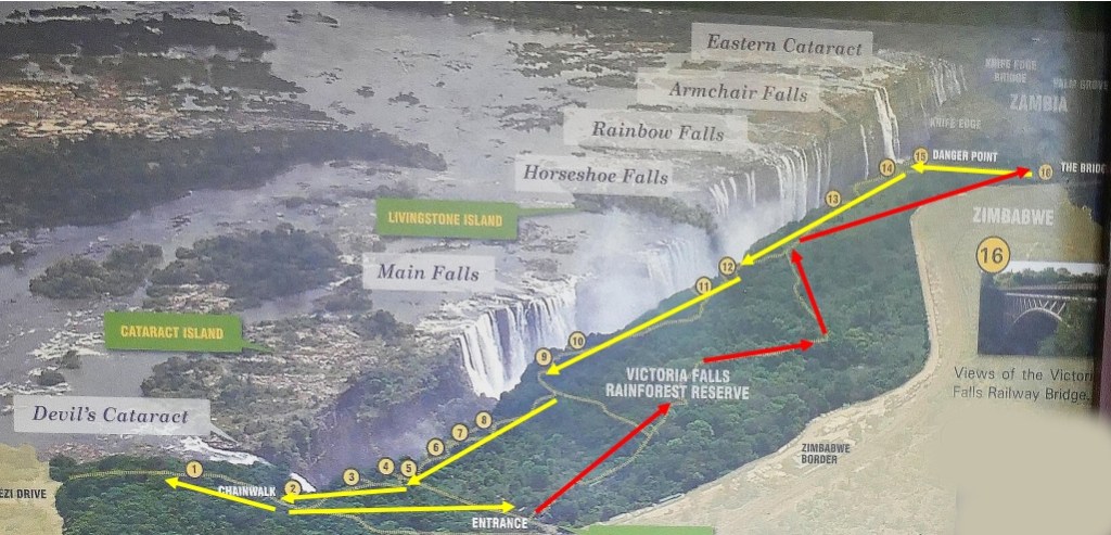 Our inspection of Victoria Falls required us to walk to where the bridge that links Zambia and Zimbabwe was located (Red arrows below). This trail took us to where the first waterfall, the Eastern Cataract, is located.