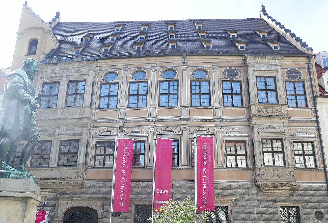 We had booked our two nights in Maximillian Hotel, walked down Maximillian Strasse and after turning left at the church of St Moritz, we found ourselves at the back of the large Museum building in Augsburg, Maximillian Museum (below). They were all named after the Bavarian King Maximilian II. We would encounter this character again when we visited his castle in southern Germany as well as his giant statue in Munich.