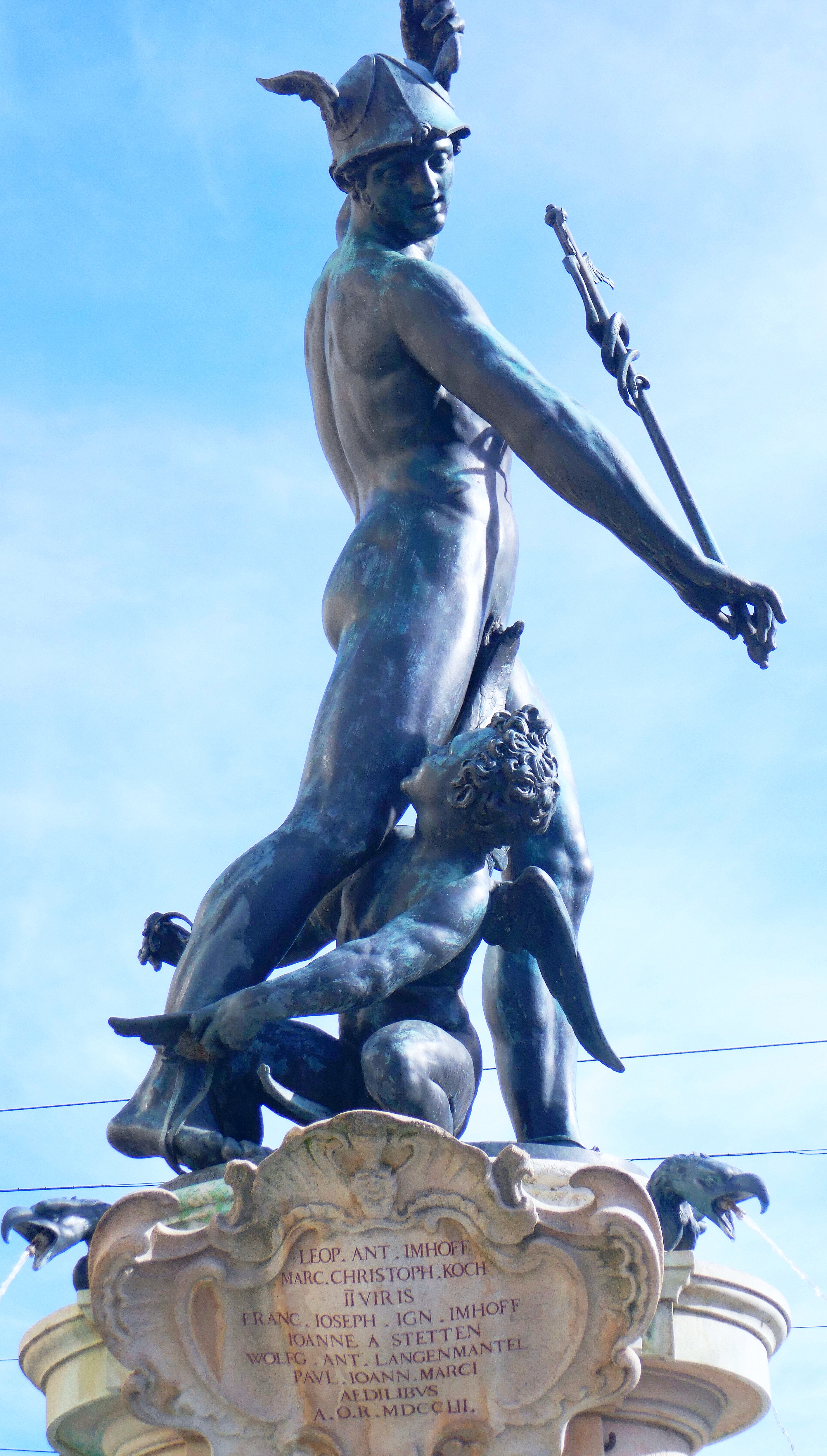 Below are images of the Mercury Fountain, the second major piece of the town’s famous Water Management System; if we had have continued on down Maximillian Strasse, we would have encountered the third and the most amazing fountain, The Augustus Fountain. These three facilities sit in a straight line down this main street of Augsburg.