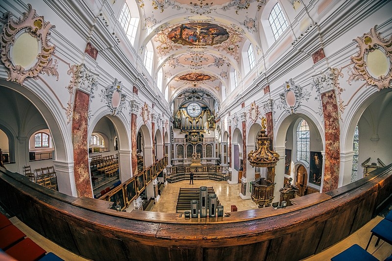 We asked one of the hotel receptionists for a restaurant recommendation nearby for our evening meal before we left on our first stroll around the centre of Augsburg. She gave us one that we could find in the centre of town in a platz not far from the Rathaus. We headed down Maximillian Strasse and made a left turn at Moritz Platz. This was a significant spot in town because on the corner was the attractive Church of St Moritz, the photo on the left below was taken near the other significant local site nearby, the fountain of Mercury. St Moritz (Maurice) was a Roman Military Captain who also happened to be an early Christian. He refused orders to randomly execute locals on one of the campaigns he was involved in and this refusal resulted in all members of his legion being executed. He is the patron saint of many professions including knights. His huge image is painted on the wall of this Catholic Church, a building that was also destroyed during WW2 and rebuilt in 1946.