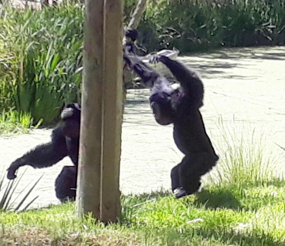 Generally the Siamang spend their lives in the tops of the trees well away from the dangerous forest floor but the couple we were watching not only hooted away but were relaxing on the ground, making use of the ropes and the steel hawsers that held up the posts on their island. Their acrobatic behaviour seemed designed to entertain each other and not the zoo spectators.