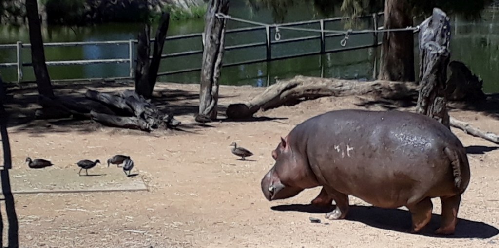 The enclosure beside the Gibbon’s lake was a large one including a yard and a small lake to cater for the third largest land mammal after the elephant and the rhinoceros, the Hippopotamus (Hippopotamus amphibius). They are semi-aquatic animals which was illustrated when we visited, with most of the hippos almost totally submerged in the lake. Curiously the closest living relatives of the hippo are not pigs, but the group of sea creatures titled ‘Cetaceans’, the whales, dolphins and porpoises. The most recent theory on the origin of Hippos is that they branched off from a common ancestor about 54 million years ago. One other attribute of the hippo that humans need to be aware of is that they are considered the most dangerous animal in the world for humans due to their aggressive and unpredictable nature