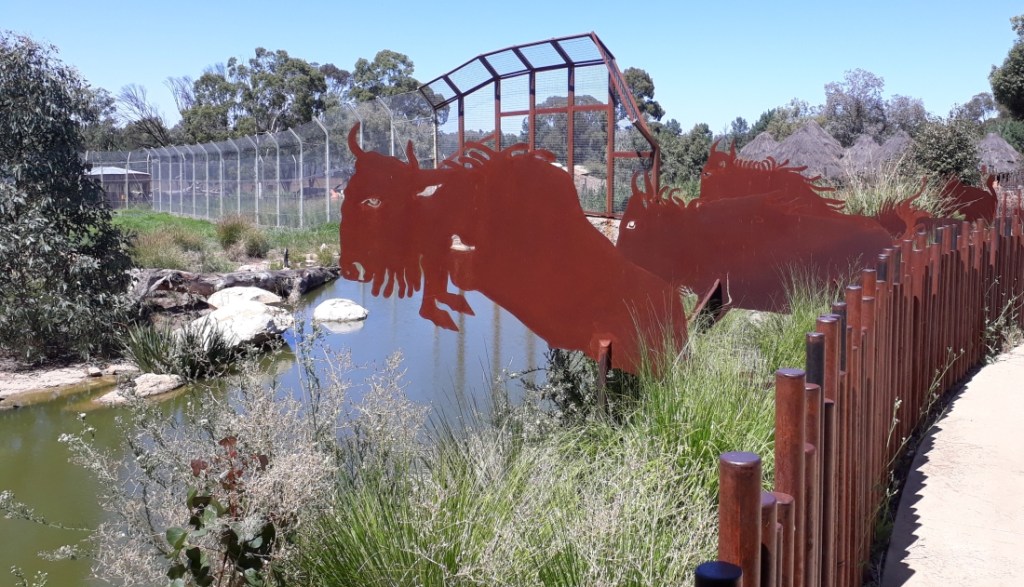 By the time we had reached the 4 km point on our bike tour of Dubbo Zoo, we were getting tired and ready for a rest. We took some decisions to be selective as to the animals we would check out in the rest of our time at the zoo. For example, we skipped the Australian species given we were already reasonably familiar with these animals. We decided to go directly to the Lion enclosure which after the Savannah area, appeared to be the largest enclosure at the zoo. Despite the steel wool sculpture of the lion at the front entrance to the area as well as the metal cut-outs of the lion’s traditional victims, the Wildebeest, we were disappointed we could not spot the lions.