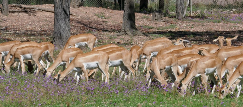Riding back towards the Zoo entry after morning tea, our first enclosure belonged to the Blackbuck (Antilope cervicapra) which is an antelope native to India and Nepal. It was quite the contrast to the behaviour in the Barbary Sheep area; there just appeared to be a large group of female blackbucks grazing peacefully together with no pushing or shoving. Apparently this is normal for Blackbucks as the larger males form separate groups and can be distinguished from the female due to their two-tone colouration. The Blackbuck is extinct in Pakistan and Bangladesh and is found mainly in India but its numbers are declining sharply due to hunting, deforestation and general habitat degradation.