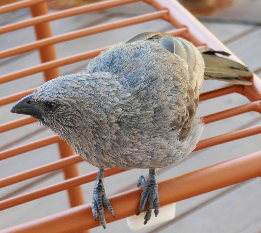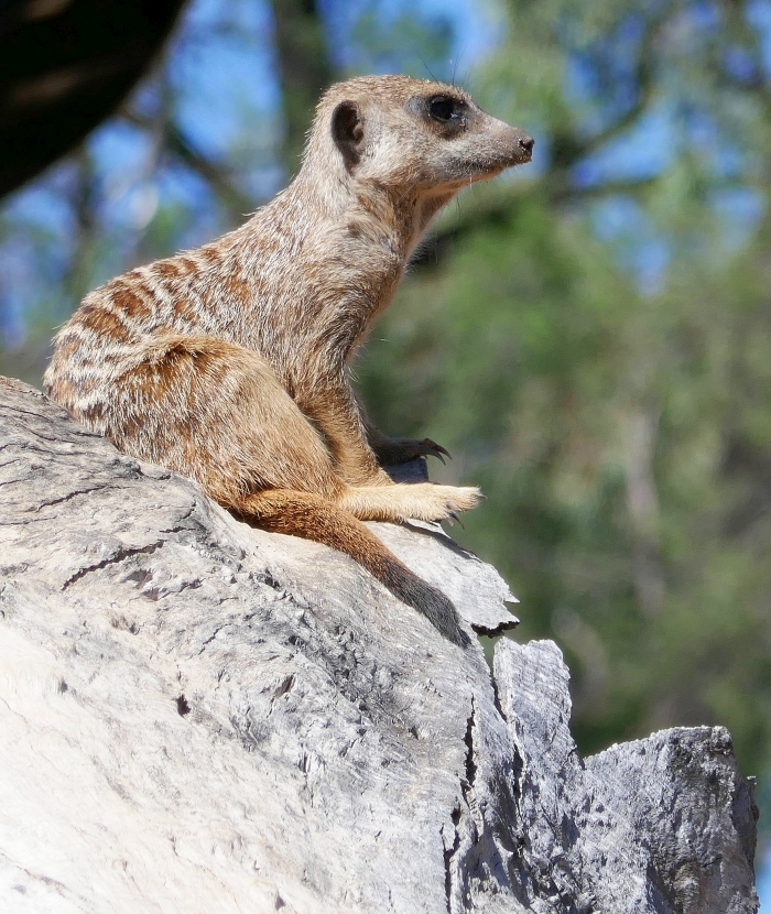 As we entered the Waterhole building, we passed another enclave of Meerkats that illustrated one of the key features of a Meerkat community. While the rest of the meerkats are having fun, the lowest ranking meerkat in this hierarchical society is given the job of ‘lookout’ for approaching enemies. The bird on the right, the Apostle Bird, which I had never seen before was not an exhibit but an annoying pest that insisted I share my banana bread with it.