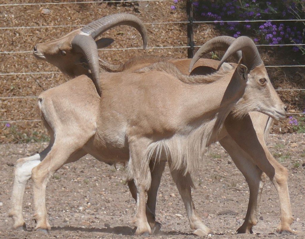 While we were having our coffee, our table was right next to the barrier that protected the Barbary Sheep (Ammotragus lervia) from our intervention in stopping the constant harassment they seemed to inflict on each. These characters are the only wild sheep from Africa and they rely on camouflage in the rocky hills and deserts to hide from predators. Few of these Barbary Sheep spent their time on camouflage in their enclosure. They spent their time pushing and shoving each other continuously as shown by the image on the left. Sometime three sheep involved themselves in a group rumble. They don’t appear to be in danger of extinction, particularly because they are very widespread in the zoos of the world