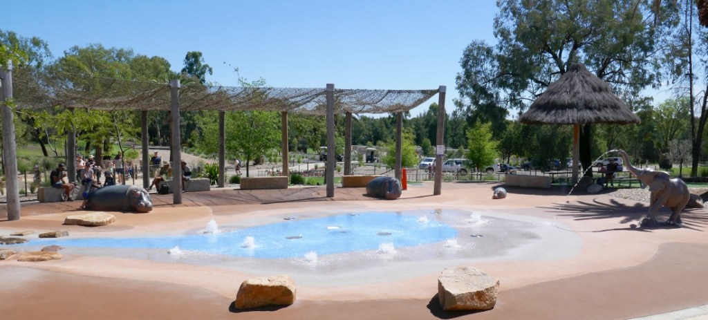 Next stop was the café but it offered a great deal more than just food or drink, particularly for visiting families. The image below shows a shallow pool at the entrance to the waterhole and small children were having a ball in it as we arrived. Lounging around it were three very life like Hippopotami and one spraying elephant.