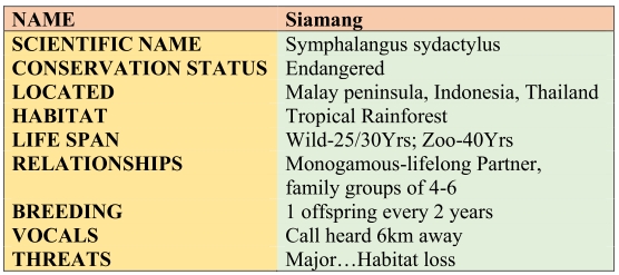 The Siamang have hooked shaped hands, long arms and a shoulder that allows for a long range of motion and an extended swinging action. They can reach speeds of up to 56 km in the trees and leaps of 9 metres in a single bound…very impressive characters
