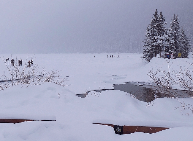 The photo to the left here was taken from the window of our room in the Fairmont. It shows where the buses and taxis pulled up with passengers having to survive the 10 metre walk to the door of the hotel. However the rest of the folk at the Fairmont didn’t seem too worried by the continuously falling snow…lots of customers took the opportunity to go for a walk on the lake and its shoreline.