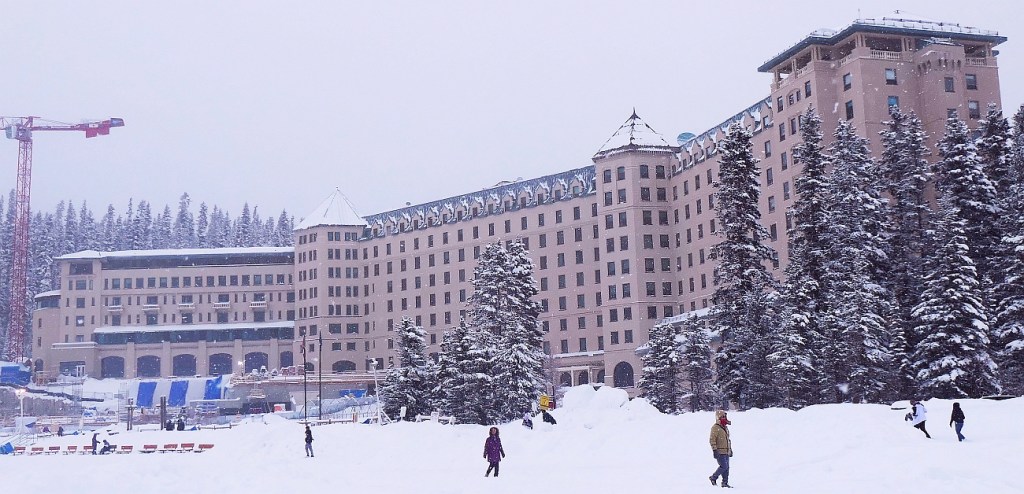 The photo on the right of Lake Louise is obviously taken in Summertime. (Courtesy Wikipedia.) The photo below is the Fairmont Chateau not long after our arrival. It was still snowing and it looked to me like all the facilities of the hotel were going to be covered in snow during our stay.