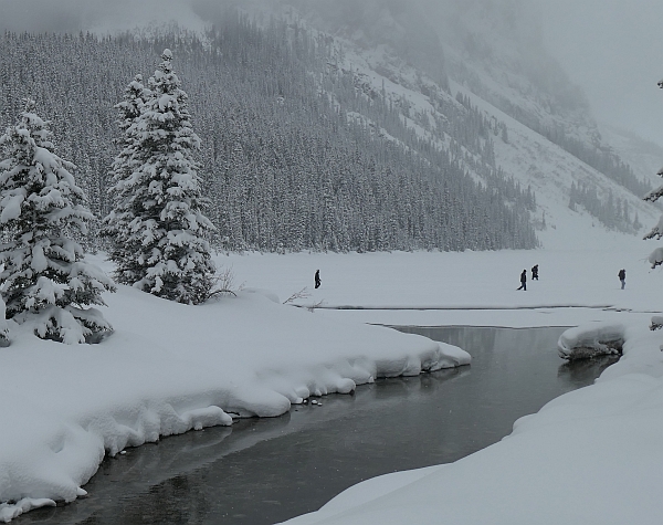 It was probably a good thing that as a couple we decided we would not dance on the icy surface of Lake Louise like the other couple we came upon who were preserving images of skating and dancing as the snow fell