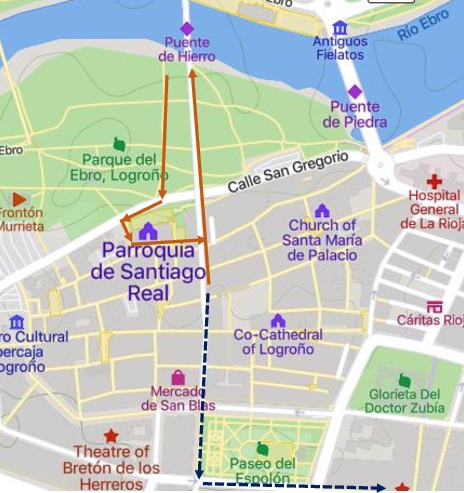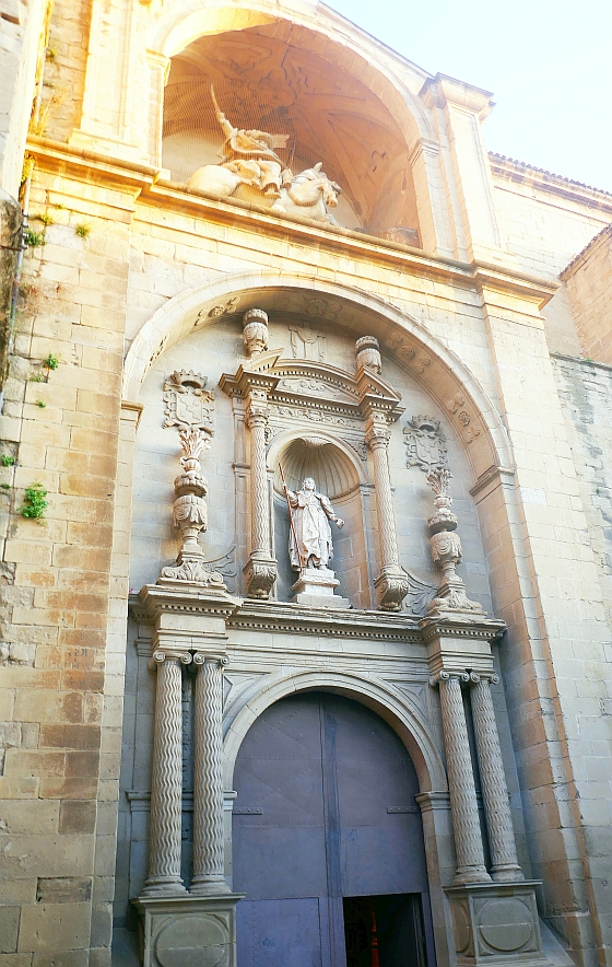 The real gem of my morning walk was to discover the Church of Santiago el Real, hidden away among the buildings across the road from the river park, Parque de’ Ebro. From the river park, one side of the towering church could be seen but to reach the front entrance, I had to find my way around to Calle de Santiago. There was originally an old medieval church on the site that had been largely destroyed by fire. The current church was started in the 1570s and the Renaissance façade was built a century later, started in 1669 (see photo below right). At this stage I didn’t know the name of this huge church but I started to get the message when I noted the name of the street, the carved pilgrim shell in the wall and finally the name of the square nearby, Plaza de Santiago.