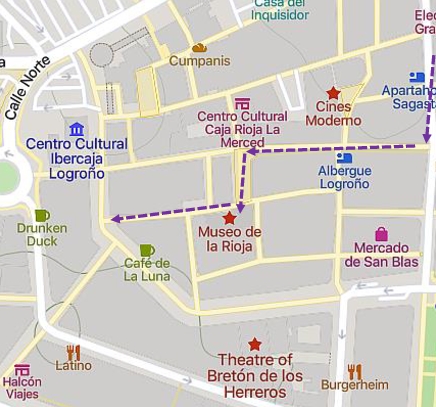 Our only evening in Logrono was a key part of our Intrepid Tour package…visiting the famous Tapas bars of the city. There is a particular street that all tourists head for in town called Valle Laurel where many of the estimated over 50 Tapas Bars in town can be found. Our evening was spent casually going to 3 or 4 bars, tasting their Tapas and the local wines of the region. Not having had much experience of Tapas, I was pleasantly surprised at how delicious they were and realised that it might be a good idea to start experimenting with this cuisine when we went home. We didn’t have to walk far from our hotel when we set out that night as the map on the left bshows. Our walk took us past the two buildings of the Museo de la Rioja on the way to the Tapas Bars but there was no opportunity for visiting, either tonight or the next morning.