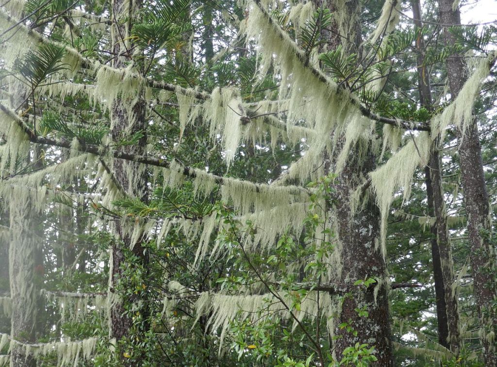 After dealing with the wind and rain, we hurried back to our car and noticed the curious adornment on the tree we were parked under. The Norfolk Pine was draped with a pale-green lichen called ‘Old-Man’s Beard’ that seemed to be a very attractive addition to the tree. Apart from being an adornment, this lichen is a good indicator of air quality… if air quality is good, the beard grows longer, if air quality is poor it may only grow to a few millimetres.