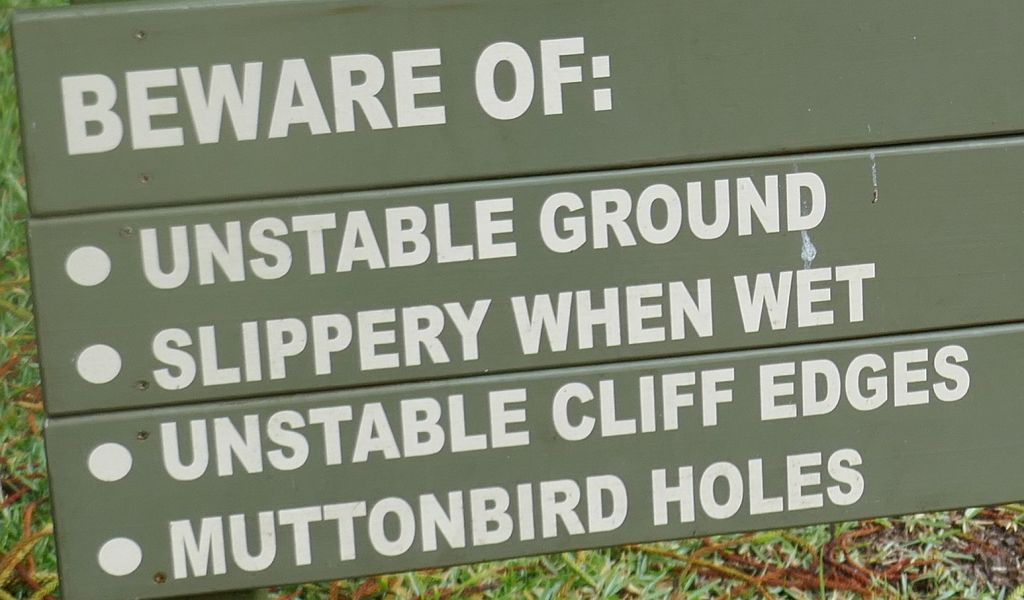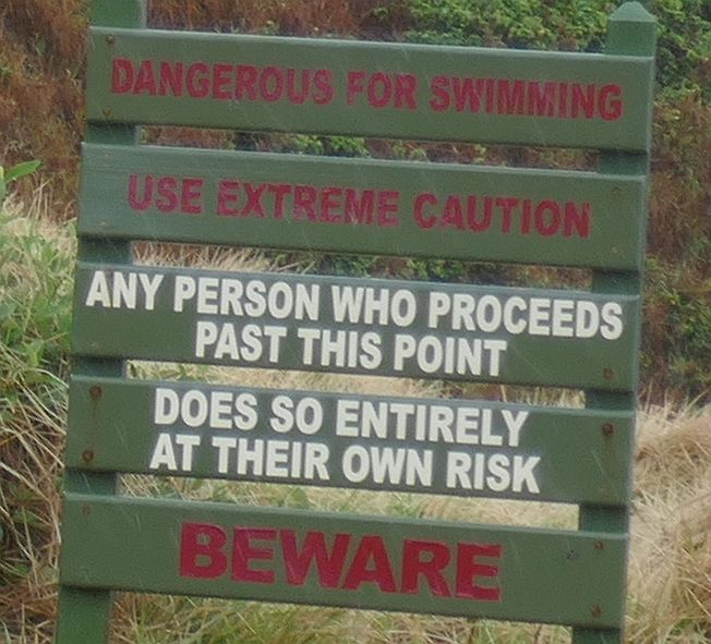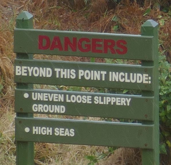 The scenery was rugged and beautiful at the bottom of the hill and the sea was very rough that morning. We didn’t find the actual Crystal Pool anywhere around the headland but we were told later that the headland was a favourite spot for the local surfers who clearly knew no fear! The photo of one side of the Point can be seen below right and the cliff edge can be seen quite clearly. Not far from the cliff edge were the two signs on the left below that warned us of dire consequences of getting too close to anything. Luckily the scenery was worth the dangerous stroll down the hill.