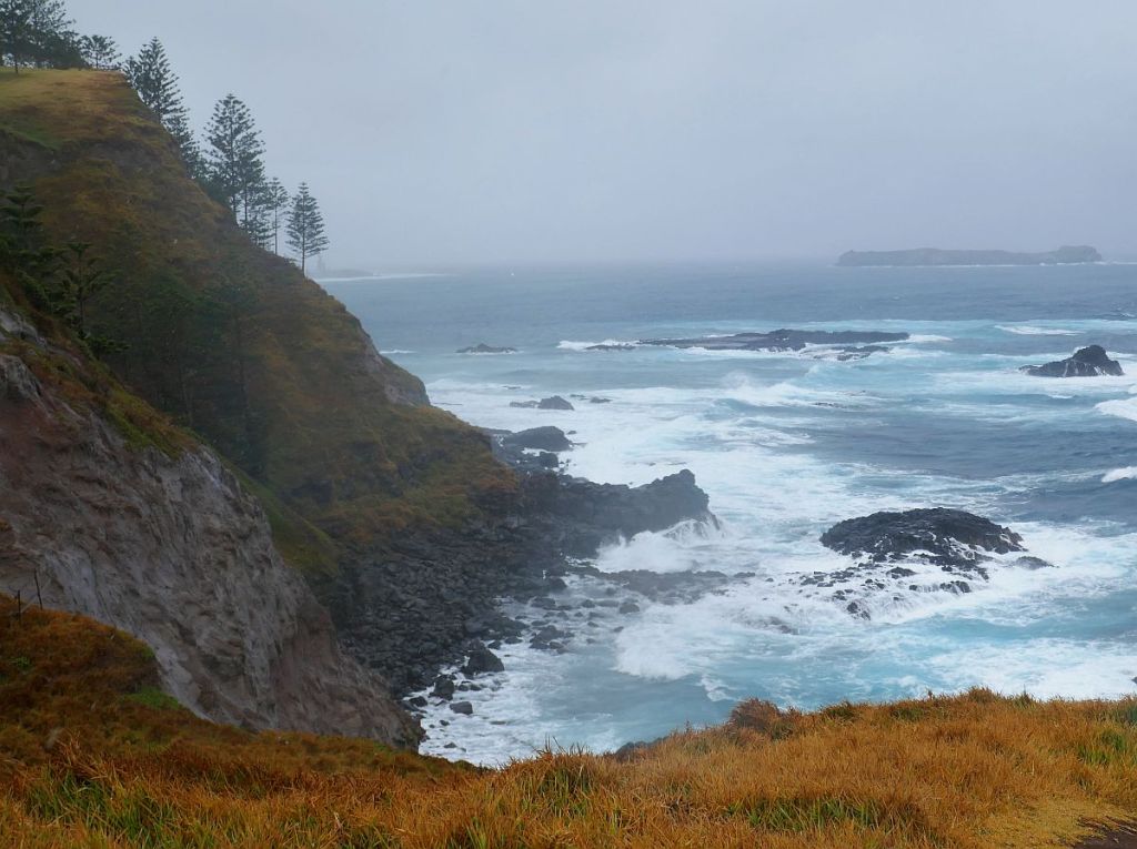 When we woke up on our second day on Norfolk Island, the weather had turned against us and a fine rain changed our plans for the morning. Walking didn’t seem a good option so we decided we would have a look at the west and north coast of Norfolk by car. Perhaps the rain would stop and the views would be great. Our destination was to check out the site where Captain Cook landed back in 1774. Normally on most Islands if you drive from one end to the other end, it would take quite a long time…at approximately 8 Km long, it is only the hilly country that slows down the drive. We drove through the centre of Burnt Pine and headed for the west coast along Douglas Drive.