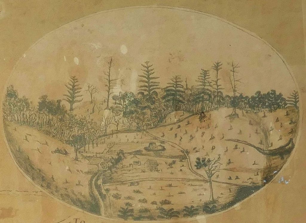 By the time we made it back to the top of the hill dodging muttonbird holes, the rain had stopped. We were now left with a clear day and time before lunch to have a quick look at the ruined water-mill at the top of Arthur’s Vale or, as its known today, Watermill Valley. It is the valley directly behind Kingston and was where the first farming on Norfolk Island occurred after the first settlers arrived in 1788. A wooden water mill was built here by the first settlers but it was succeeded in 1828 by a stone water mill, the ruins of which still stand today beneath the dam, the original of which would have powered the mill in the 19th century. This mill was eventually replaced by the Crank Mill down on the shoreline. These mills were essential for the survival of the settlers on Norfolk as they provided the flour staples that were the basic food of the settlers. The image on the left below is an early diagram of the valley and the one on the right shows the dam today that once fed the water-mill.