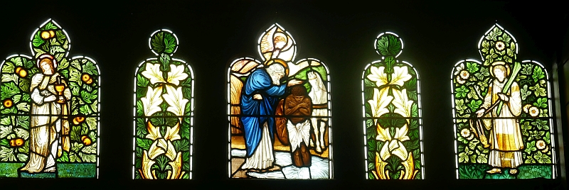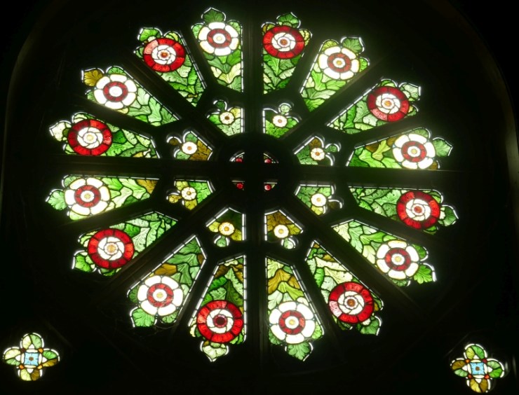 The West Rose Window is amazing and was created by the firm of William Morris in Surrey England. William Morris’s fame as both an artist and an author is still recognised more than a century after he died. His stained glass and his wallpapers grace many a fine mansion in England. Fans of fantasy novels that became prominent in the latter half of the 20th century (eg. Lord of the Rings) can thank William Morris who wrote one of the foundational fantasy novels, The Well at the World’s End (1896). He was a close friend of members of the Pre-Raphaelite group of painters who were very prominent in the late 19th century, including Edward Burne-Jones and Dante Gabriel Rossetti. Remarkable as it is to discover a rose window by William Morris, the stained glass windows in the front wall of the chapel were created by his friend Burnes-Jones.