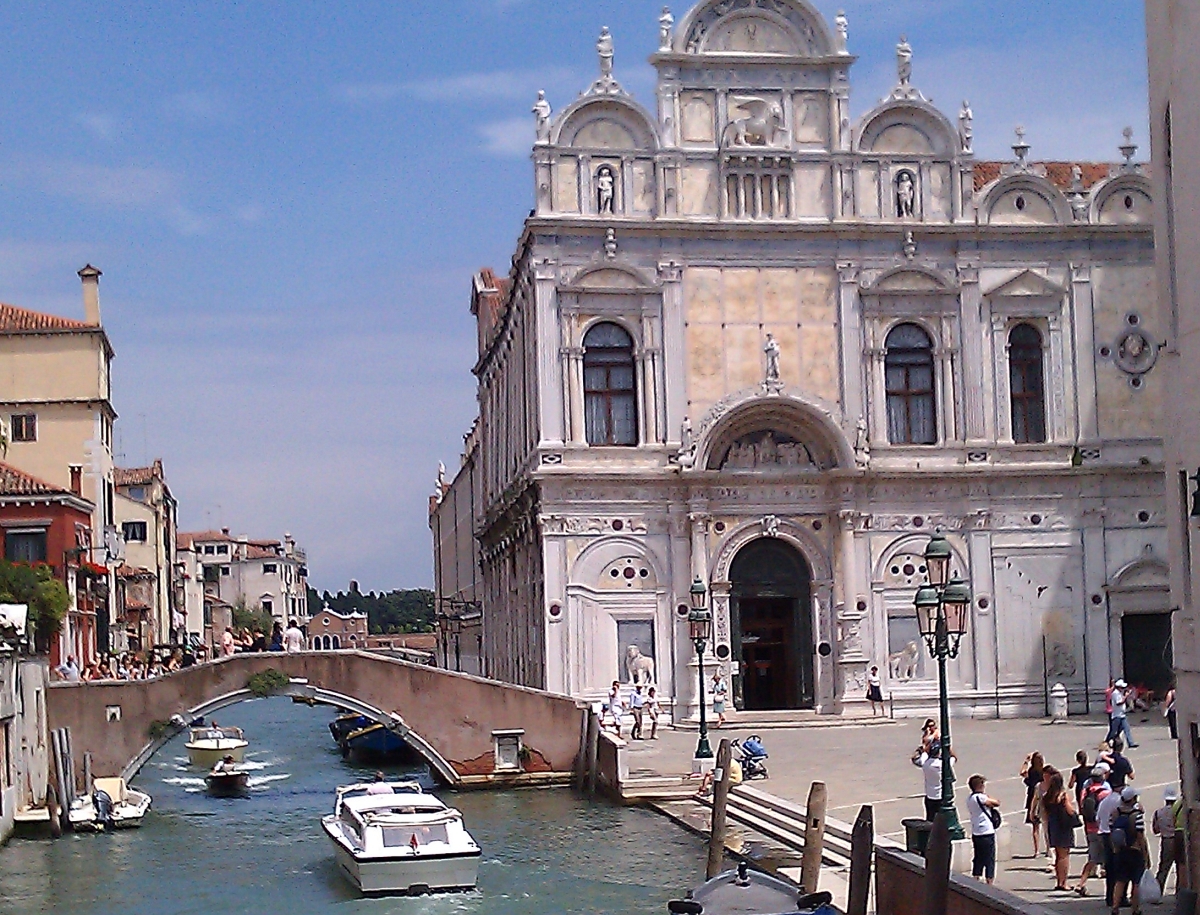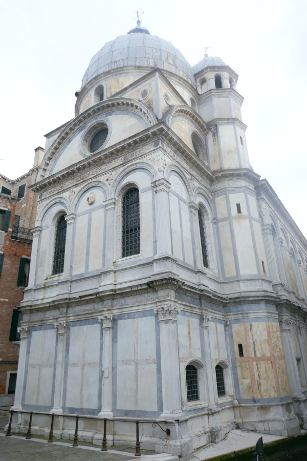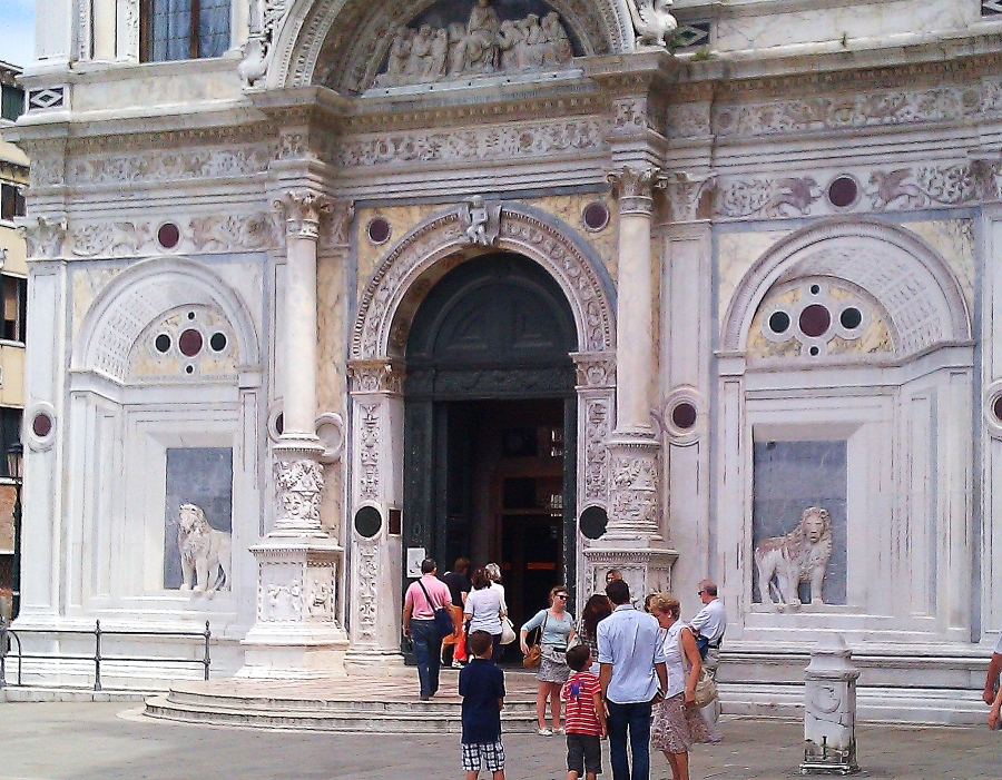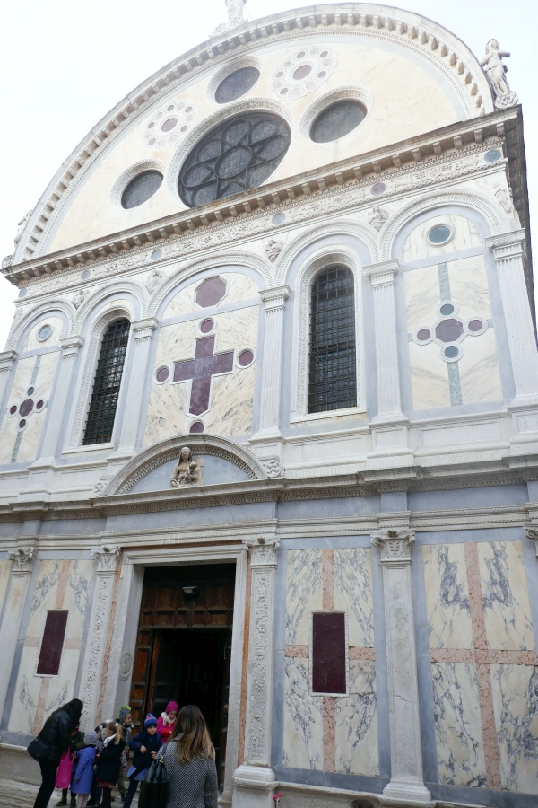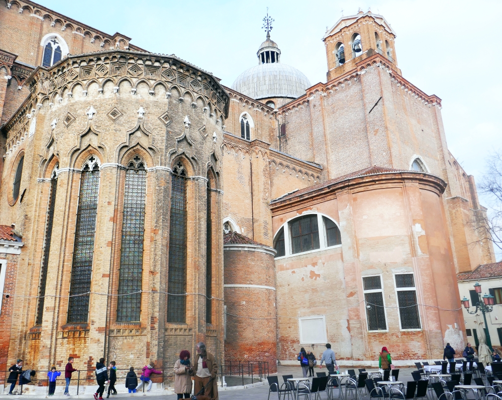 This church was consecrated in 1430 but it had started being built in 1234, taking well over a century to build for the Dominican order of monks. In the photo to the left above can be seen the canal running beside the campo and a bridge crossing over to the square that surrounds the church complex. The building that sits on the edge of the canal should remind visitors of Santa Maria Miracoli because the walls are made from marble sheeting like the previous church visited. This building is called the Scuola Grande (‘Great School) San Marco…there are six of these buildings in Venice and they began in the 13th century and were charitable and religious institutions. Today this building is the local hospital.