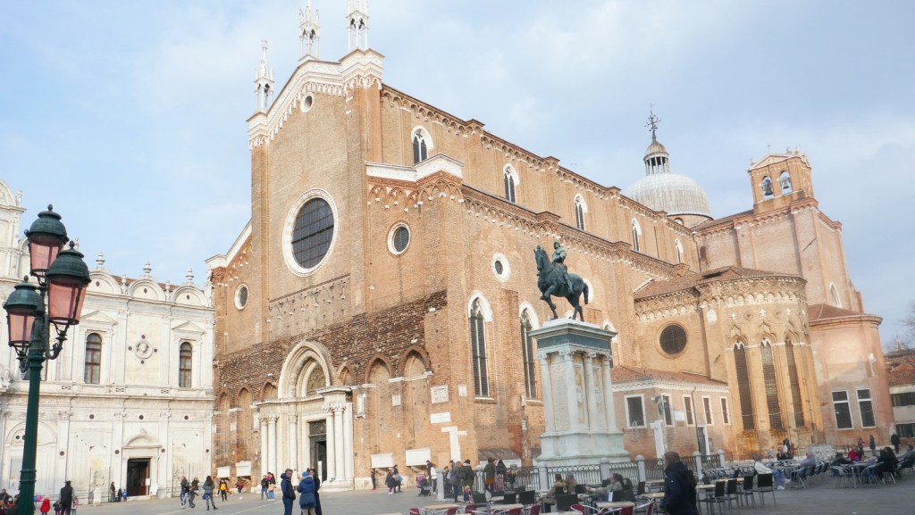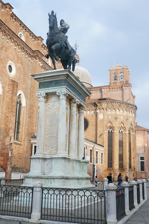 There is a very large equestrian statue that stands level with the front door of this minor basilica. It is of Bartolomeo Colleoni (1400-1470), a captain-general of the Republic of Venice.