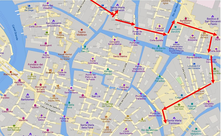 There are a couple of ways to visit these three important Venetian Churches in or nearby the Castello Sestieri. If you are staying in the Cannaregio area, you can simply take the busy path that follows the Grand Canal around towards the Rialto Bridge before branching off to find Santa Maria dei Miracoli. The other method is to take the direct route through Cannaregio via the maze of alley ways to Rialto and then head left after crossing the bridge.