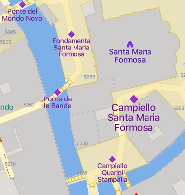 The map to the right shows the extent of the Campiello (Venetian Square) around Santa Maria Formosa. It is quite extensive by Venetian standards. The photo below, taken from the edge of the canal, shows the large square in front of the church and also illustrating that the church and the bell-tower are just two of the features of this area. Local houses and Palazzos (note image of the white Ruzzini Palace Hotel below the image of the Campiello) are just some of the key elements of this community.