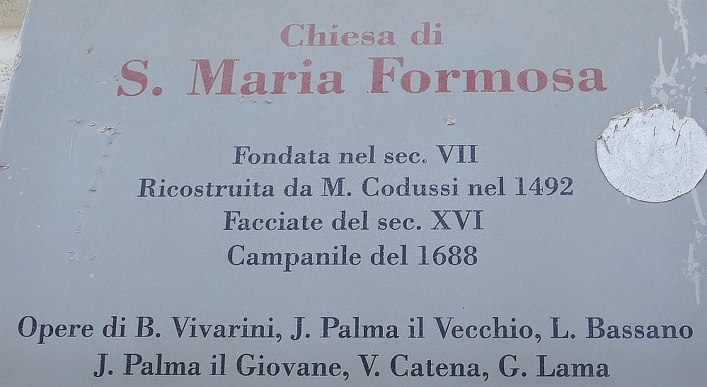 One of my minor habits when I arrived at a church on my walks around Venice was to take a copy of the details on the silver plaque which listed the basic datails of each church; it was usually attached to the façade. The plaque on Chiesa di S. Maria Formosa was a typical example.