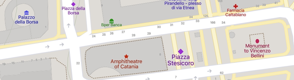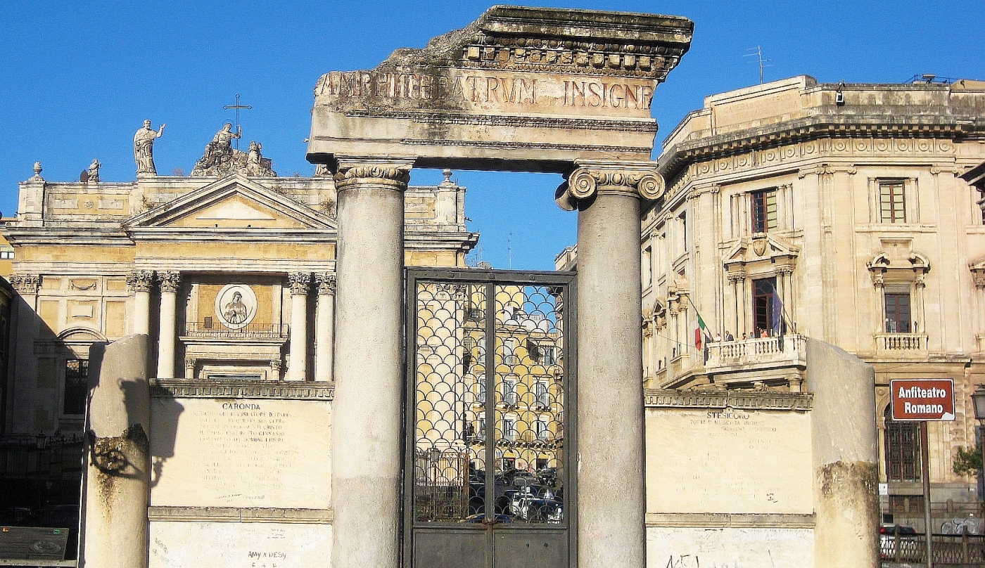 The photo below of the Piazza shows the monument to Bellini at one end and over the road (Via Etna!) is the central area of the Piazza. (A larger image of Bellini Monument can be seen below left.) On the other side of the Piazza can be seen parts of the ruins of the Roman Amphitheatre of Catania. Below right is the current entrance to the Amphitheatre. In 1906 it was decorated with two fragments of Ionic Columns and part of the original architrave inscribed with the Latin text, “Eminent Amphitheatre”. The amphitheatre was most likely built in the second century CE and is believed to have held around 15,000 spectators. The remains of the amphitheatre represent only a tenth of its original size.