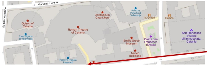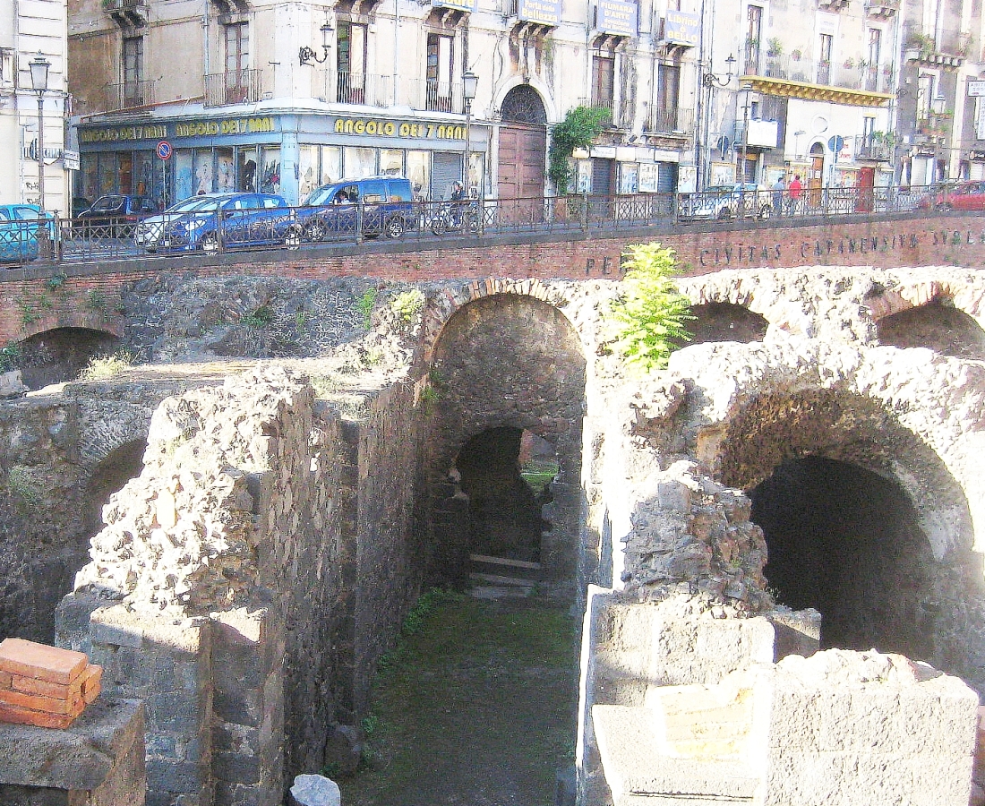After inspecting the Church of St Francis, we continued down Via Vittorio Emanuelle Secondo to the next major site of this area of Catania, another Roman Theatre and Odeon. The map of the site below shows how large an area was taken up by the Roman Theatre. However it is the usual story of the history of Catania that no site here is a clean slate…three to four centuries before the Romans built two ‘arenas’ here, there was a Greek building here, probably another theatre. The larger theatre here would have held around 7000 spectators when it was built around the first century BCE. A thousand years later, the locals no longer valued the ancient theatre and its marble was stripped to assist in the rebuilding of St Agatha’s Cathedral. It was re-excavated in the 19th century.