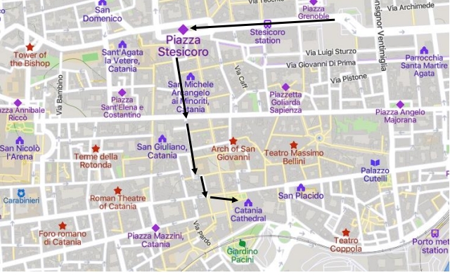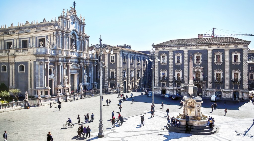It wasn’t much further to walk when arrived at Piazza Duomo which is another central square in Catania. It sits beside the Catania Cathedral dedicated to Saint Agatha. As I commented earlier, buildings in Catania live dangerous lives given that their neighbour is an active volcano. This city’s cathedral has been destroyed and rebuilt several times. It was built originally in the late 11th century over the ruins of the Roman Achillean Baths. Amazingly, a 1000 years later visitors to the Cathedral can still visit these Roman remains beneath the cathedral. In 1169 the Cathedral was destroyed and then rebuilt but like so much of Catania and was shaken to ruins again in the 1693 earthquake.