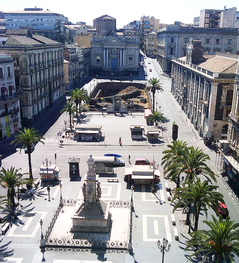 We had a morning to go for a walk around the centre of the city before we trained back across to the mainland. We made our way from our hotel to one of the main squares in Catania, Piazza Stesicoro, which was an area that contained some significant sights of the city. From here our path took us directly to Piazza Duomo where the Catania Cathedral stood. One of things we discovered about Catania was that it was a very old city having been founded around 729 BCE by settlers from Greece. Five hundred years later it was taken over by the Roman Republic during the Punic Wars with Carthage. The remnants of this early history were scattered along the path of our morning walk, generally in the form of the open-air amphitheatres. One of these Roman Amphitheatres lay partially uncovered beside Piazza Stesicoro.