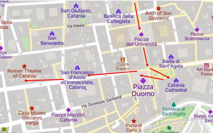From Piazza Duomo we walked about 300 metres down to the Piazza San Francesco d’Assisi where the Church of St Francis of Assisi stands (above right). St Francis himself died in 1226 CE and it was only 28 years later that his monks settled in Catania. Back in Catania’s Roman period, there was a temple of Minerva on this site. In 1329, Eleanor of Anjou, the Queen of Sicily backed the construction of a church and convent on this site dedicated to St Francis. The impressive façade of the church wasn’t built until 1854.