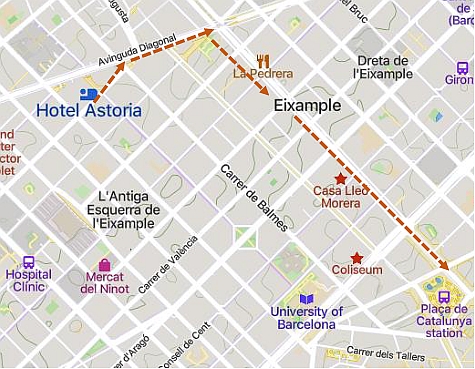We were meeting our guide on our second night in Spain, preparing for our 10 day excursion from Barcelona to the north coast of Spain along the Bay of Biscay. The map to the right shows the approximate site of Hotel Astoria which we found to be a very interesting, olde worlde place. Both on the previous evening and after breakfast on this day, we were able to explore the area around out hotel before our walking tour for the day started.