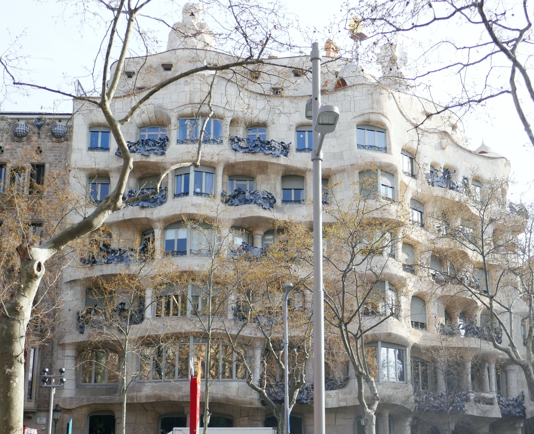 One of the curiosities of this city is that there are a few major roads that criss-cross Barcelona, enabling traffic to quickly cover large distances without being caught up in too many traffic snarls. One of these is called Avinguda Diagonal and this street was the target for our new guide. It was about 500 metres from our hotel and it wasn’t long into our stroll down the Diagonal before we realised why our guide had chosen a hotel in this area, not far from this important Barcelona street. Apart from the prevalence of street sculptures like the one on the left above, we were amazed when suddenly we found ourselves outside Casa Mila (La Pedrera), our first Gaudi Building of the trip; Antoni Gaudi was born in 1852 and 53 years later he designed and built this huge home with its wave like walls and huge chimneys on top. It was commissioned by a wealthy couple who wanted to live in a spectacular house on this cosmopolitan Barcelona Avenue.
