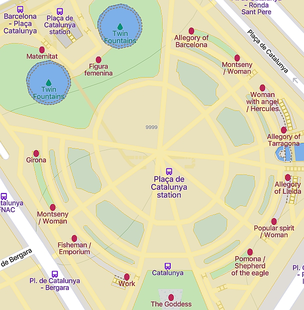 Whilst Placa de Catalunya is not the administrative centre of Barcelona, it is considered to be its city centre and the place where the old city meets the 19th century small towns that were built over the 19th and early 20th centuries. Its eminence as the place to be can be detected by the number of International embassies that are sited around this location. The square consists of 50,000 square metres and is renowned for its fountains and statues (See map,right below). One unusual claim to fame is the suggestion that the locals are particularly proud of the huge flock of pigeons that gather around the Placa.