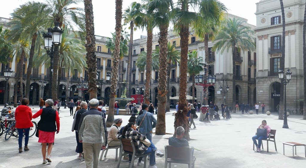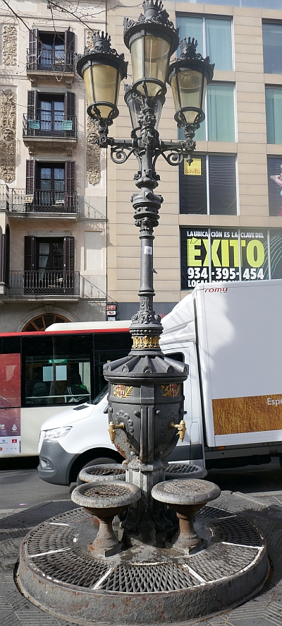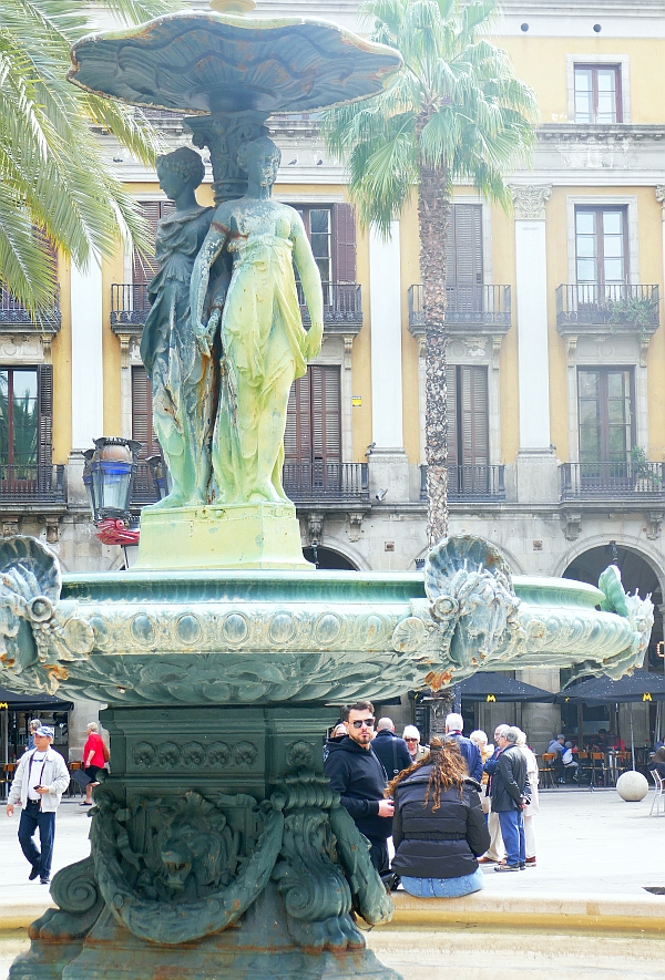 It was getting on in the afternoon and we had made an appointment to meet up with some friends at a hotel towards the end of La Rambla. Our meeting place was not far from Placa Reial and our route to this square took us back towards La Rambla. This square is famous for its fountain of the Three Graces, along with plenty of palm trees to make it a great place to stop for coffee and wile away the afternoon. The fountain was installed in 1876. The square is surrounded by a series of hotels and looks a popular venue for tourists checking out Barcelona. Note on the right above one of the curious lamps that are scattered around this Placa; another contribution by Gaudi enhancing the style of the city.