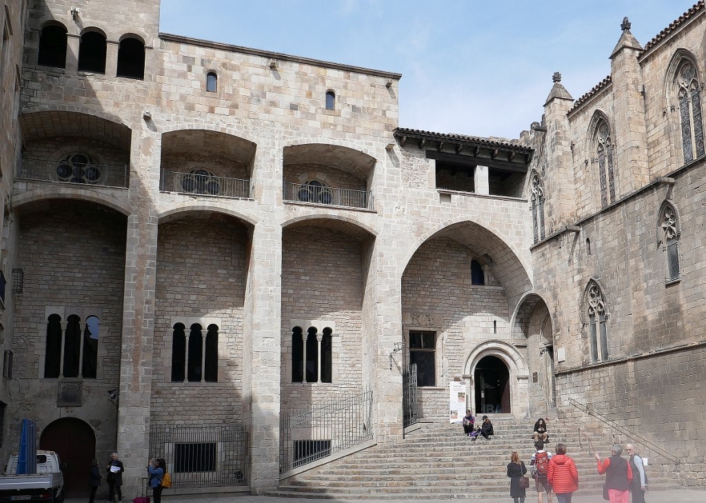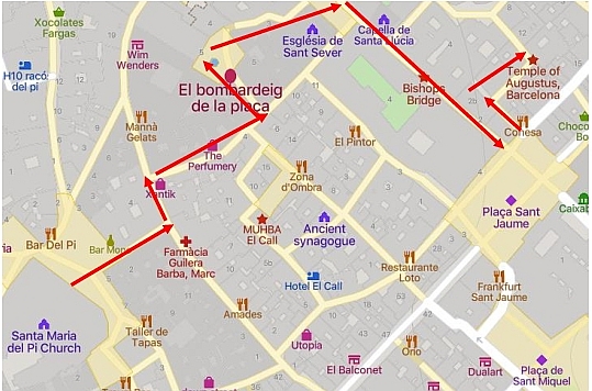 It is not known when the Temple of Augustus was demolished but it is suggested that it probably occurred somewhere round the 4/5th centuries with the rise of Christianity. The discovery of the remains of the temple was even more unusual than that of the Roman Cemetery that we had examined earlier in our walk. In the late 19th century three of the temple’s column were found on a construction site in the city. A fourth column was discovered and displayed in the Placa del Rei, over the road from the Barcelona Cathedral. The original temple would have been about 37 metres long, built on the Roman forum that was once sited where Placa Sant Jaume is today.