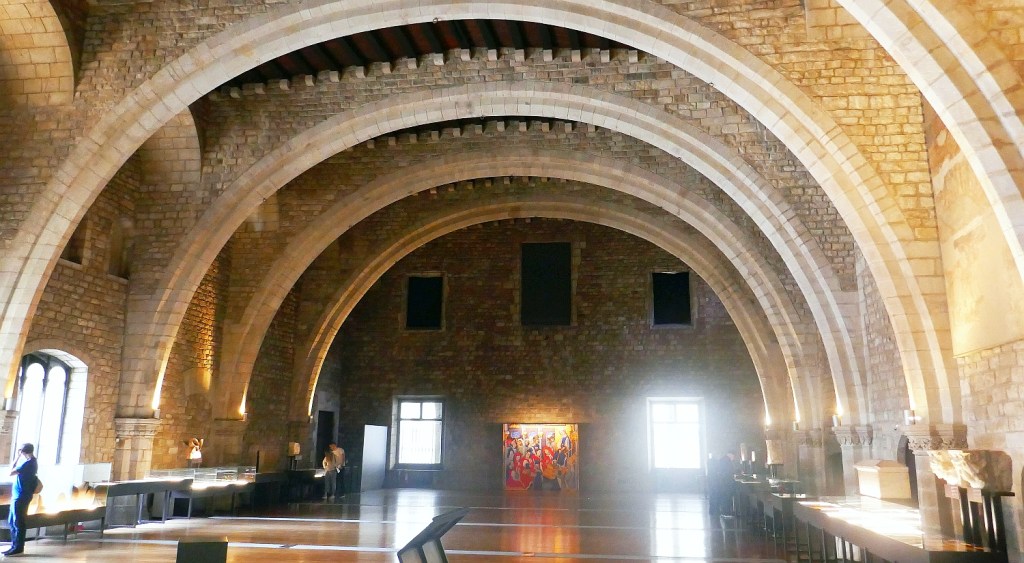 From the Temple of Augustus, our guide decided we needed to visit the Museum of the History of Barcelona which was located back in the area near the Cathedral as well as close to Placa del Rei. The image below left is of the Chapel of St Agata that sits on top of the old Roman Walls that we were able to examine the previous day when we had lunch in Placa de Ramon Berenguer. It was further along that the local youths were trying to flatten themselves against the stones of the Roman walls.