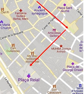 The map on the left of our walking trail for the next little while shows that our second destination continued our exploration of the Roman origins of Barcelona. We were led to a Roman cemetery used in the first to third centuries CE, originally built outside the walls of the Roman town of Barcino. We were able to inspect this cemetery from all angles along Carrer d’En Bot.