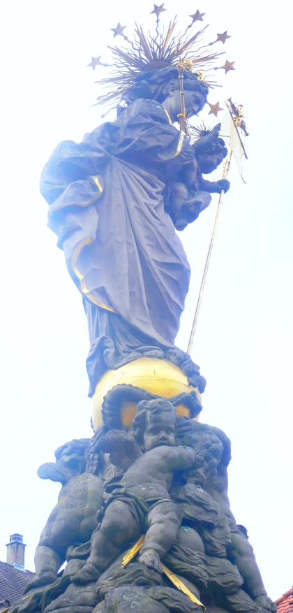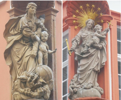 We had noticed an excellent bakery over the road from the Marketplace on our first expedition on our first afternoon in Heidelberg. We determined that this would be our target for morning tea the next day…we were not disappointed. We sat at an outside table in the sun in a piazza called the Kornmarkt, the centre of which was dominated by another beautiful statue of the Madonna and Child, created by Peter von den Branden in 1718.