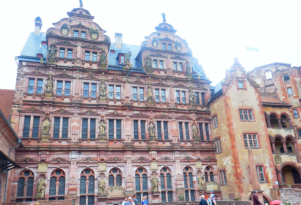 Just off the main shopping street there is an even more impressive residential palace built between 1601-1604 for the Elector Freiedrich IV. As can be seen on the image of the palace to the left below, the façade of Friedrichsbau has a series of sculptures of various powerful relatives who ruled Germany for centuries. Like the castle that overlooks Heidelberg from the mountainain on the right, this ‘Schloss’ was destroyed during the French Invasion in 1693. It was finally renovated in 1900.