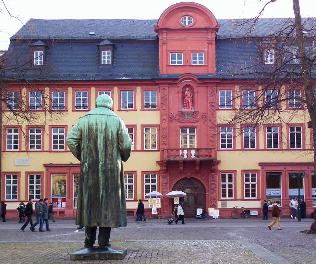 For much of the first half of Hauptrabe, this street is a modern shopping street, but many of the buildings are from an earlier age. One of the first really eye-catching buildings we encountered was the Haus zum Riesen, described as a ‘modern’ palace built in 1707-8. The curious aspect of this building is that it was constructed from the stones from the blown-up tower of Heidelberg Castle. The builder must have been a popular guy because the statue in the middle of the façade represents the builder. The house is owned by the University of Heidelberg and it headquarters various institutes of the university.
