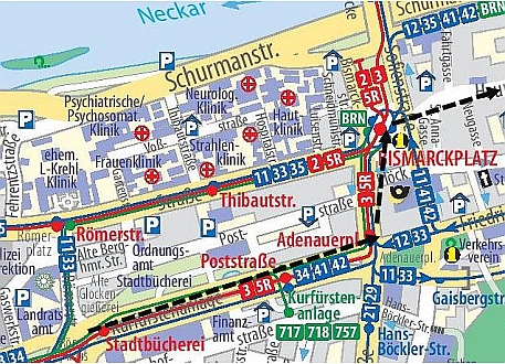 The tourist area of Heidelberg is the Alstadt area that runs along the banks of the Neckar River. The centre of this area is the Kornmarkt area near the Heidelberg Rathaus. This is at the end of Hauptstrabe that starts at Bismarckplatz and goes all the way down past the Rathaus and stops at the memorial city gate, Karlstor. We did this slow walk down to the Kormarkt area on both days we were in Heidelberg and it was such an interesting street that the length of the walks there and back were no great drama. The map to the left shows approximately where out hotel was with the black dashes arrow showing our route to the Hauptstrabe.