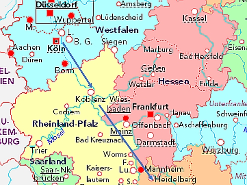 From Cologne we stopped off at Koblenz in the state of Rhineland Pfalz and onto Heidelberg in the state of Baden Wurttemberg. This time our city for the next two nights is on the Neckar River. The city is famous for its universities, particularly in the area of the sciences. We were staying at the Holiday Inn Express Heidelberg which was a very comfortable place. One of its attractive qualities was that it had guest-parking, something that most hotels didn’t have, particularly if they were close to the old town area. (allstadt)